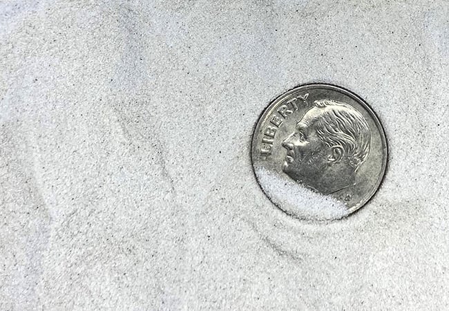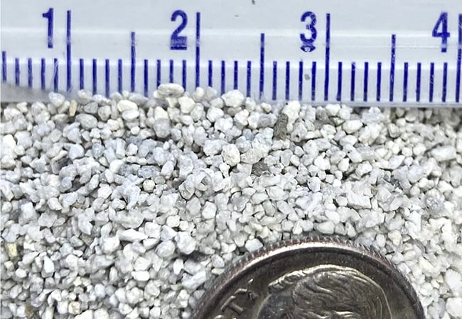 Dimension Grit is sourced from the Hess Pumice deposit in southeast Idaho, which features a consistent Mohs-scale hardness of 6. By way of comparison, obsidian (also a volcanic glass, like pumice) has a hardness rating of 5. Feldspar rates a 6. Ordinary steel weighs in between 4 and 4.5 on the Mohs Scale. Cobalt is at 5.5 and titanium at 6. Quartz and porcelain hit 7. Diamond tops the chart at 10. All this to say that Dimension Grit granules are hard enough to hold up, yet with a friable foamed-stone form factor that 1) binds tightly into the coating matrix and 2) tend to break down under load instead of popping out of the binding coat—in other words, pumice wears along with the coating. And its glassy character means those newly exposed edges are sharp and grippy.